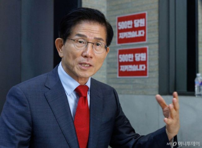 [the300]통관] 김문수 국민의힘 당대표 후보 인터뷰 김문수 국민의힘 당대표 후보 인터뷰 /사진=이기범 기자 leekb@ "지금 국민의힘은 양떼 같습니다. 정부와 여당이라는 늑대무리에 맞서 뭉쳐 싸워야 하는데 도망가려고만 합니다." 민중기 특별검사(김건희 특검)팀의 압수수색을 막기 위해 서울 여의도 국민의힘 당사 1층에서 7박8일째 농성 중인 김문수 국