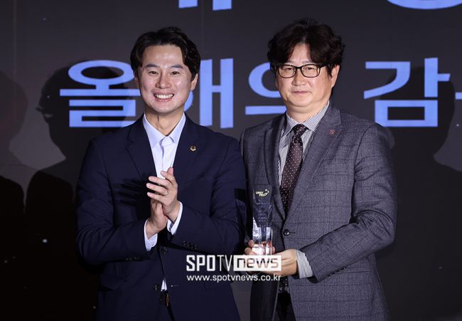 한국대학축구연맹이 29일 오후 경기도 수원시 영통구 아주대학교 율곡관에서 '2025 KUFC(한국대학축구연맹) AWARDS'를 진행했다. 대상(올해의 감독)을 수상한 단국대 박종관 감독(오른쪽)이 경기도의회 문화체육관광위원회 황대호 위원장과 기념 촬영을 하고 있다. <저작권자 ⓒ SPOTV NEWS. 무단전재 및 재배포 금지>