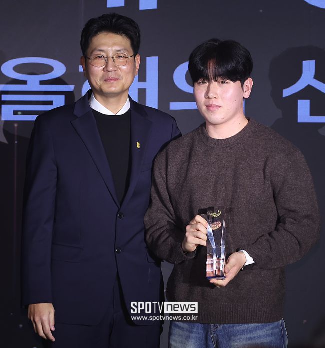 한국대학축구연맹이 29일 오후 경기도 수원시 영통구 아주대학교 율곡관에서 '2025 KUFC(한국대학축구연맹) AWARDS'를 진행했다. 대상(올해의 선수)을 수상한 단국대 고경록(오른쪽)이 한국대학축구연맹 박준호 부회장과 기념 촬영을 하고 있다. <저작권자 ⓒ SPOTV NEWS. 무단전재 및 재배포 금지>