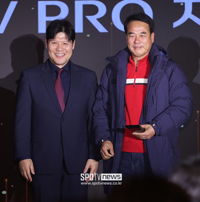 한국대학축구연맹이 29일 오후 경기도 수원시 영통구 아주대학교 율곡관에서 '2025 KUFC(한국대학축구연맹) AWARDS'를 진행했다. UNIV PRO 지도자상을 수상한 조선대 한영일 감독(오른쪽)이 스포페이 김대수 대표와 기념 촬영을 하고 있다. <저작권자 ⓒ SPOTV NEWS. 무단전재 및 재배포 금지>