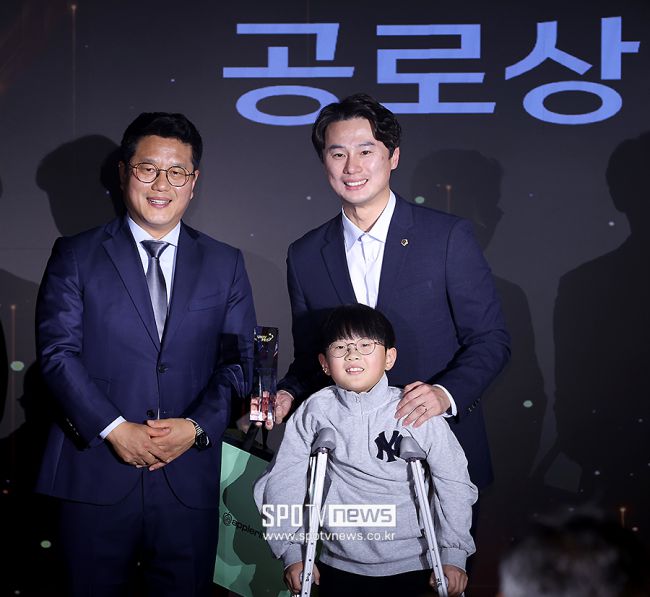 한국대학축구연맹이 29일 오후 경기도 수원시 영통구 아주대학교 율곡관에서 '2025 KUFC(한국대학축구연맹) AWARDS'를 진행했다. 공로상을 수상한 경기도의회 문화체육관광위원회 황대호 위원장이 한국대학축구연맹 박한동 회장과 기념 촬영을 하고 있다. <저작권자 ⓒ SPOTV NEWS. 무단전재 및 재배포 금지>