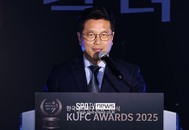 한국대학축구연맹이 29일 오후 경기도 수원시 영통구 아주대학교 율곡관에서 '2025 KUFC(한국대학축구연맹) AWARDS'를 진행했다. 한국대학축구연맹 박한동 회장이 격려사를 하고 있다. <저작권자 ⓒ SPOTV NEWS. 무단전재 및 재배포 금지>