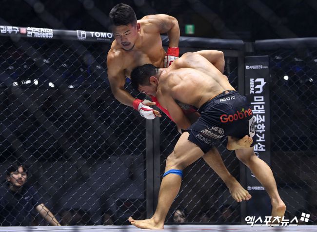 28일 오후 서울 중구 장충체육관에서 열린 ‘굽네 ROAD FC 073’ 밴텀급 김현우와 으르스켈디 두이세예프의 경기, 김현우가 으르스켈디 두이세예프의 공격에 쓰러지고 있다. 고아라 기자 iknow@xportsnews.com