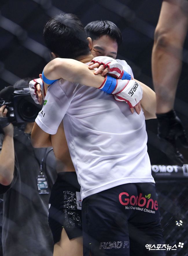28일 오후 서울 중구 장충체육관에서 열린 ‘굽네 ROAD FC 073’ 스페셜 이벤트 매치 윤형빈과 밴쯔의 경기, 윤형빈이 TKO승을 거둔 뒤 밴쯔와 포옹을 하고 있다. 고아라 기자 iknow@xportsnews.com