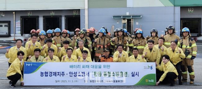 농협(회장 강호동) 경제지주(농업경제대표이사 박서홍)는 5일 농협 안성농식품물류센터에서 직원들의 화재대응 역량강화를 위해 소방훈련을 실시했다. 이날 소방훈련은 안성소방서와 합동으로 실시된 가운데 정승일 경제기획본부장, 신인철 안성소방서장, 안성 관내 농협 조합장 및 사무소장 등 120여 명이 참여했다. 직원들은 안성 소방서 장비(소방차량 13대, 드론 1대