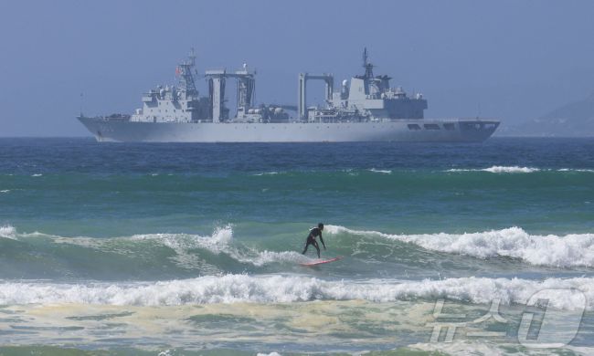 (케이프타운 로이터=뉴스1) 이정환 기자 = 중국, 러시아, 이란 등 '브릭스 플러스' 국가들의 남아프리카해 합동 해상훈련을 앞둔 7일(현지시간) 남아프리카공화국 케이프타운의 사이먼스타운 해군기지 인근 파슬 베이에서 한 서퍼가 중국 선박 앞에서 서핑을 즐기고 있다. 2026.01.07. ⓒ 로이터=뉴스1 Copyright ⓒ 뉴스1. All rights r