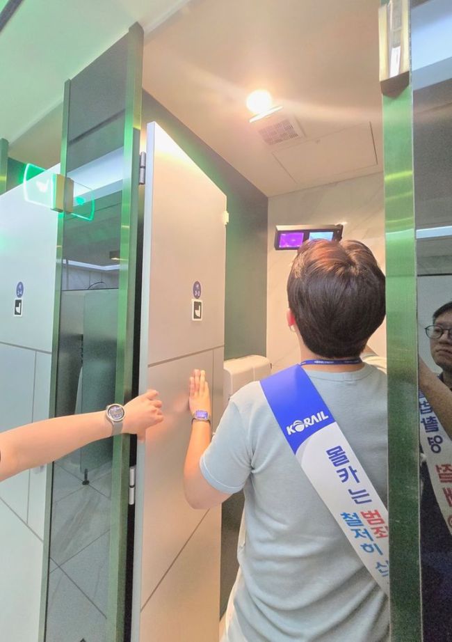 [서울=뉴시스] 한국철도공사(코레일)가 철도특별사법경찰대와 함께 12일 오전 대전역에서 불법촬영 예방 캠페인을 펼치고, 화장실 등에서 불법촬영 기기 설치 여부를 점검하는 모습. 2025.06.12. (사진=코레일 제공) photo@newsis.com *재판매 및 DB 금지 [서울=뉴시스]이연희 기자 = 한국철도공사(코레일)가 12일 오전 대전역에서 철도특별