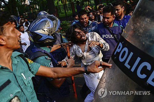 경찰에 체포되는 시위대 [AP 연합뉴스. 재판매 및 DB 금지] (자카르타=연합뉴스) 손현규 특파원 = 방글라데시 공군 훈련기가 학교 건물에 추락해 32명이 사망한 가운데 추락사고 현장 인근에서 원인 규명을 요구하는 시위가 벌어지자 경찰이 이를 무력으로 진압하는 과정에서 학생 80명이 다쳤다. 23일(현지시간) AP 통신 등에 따르면 지난 21일 오후 1시