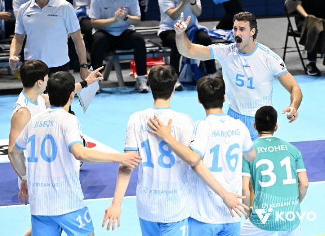 프로배구 대한항공 선수단.(KOVO 제공) (서울=뉴스1) 서장원 기자 = 프로배구 대한항공이 한국전력을 누르고 시즌 첫 승을 거뒀다. 대한항공은 23일 인천 계양체육관에서 열린 진에어 2025-26시즌 V-리그 남자부 한국전력과 홈 개막전에서 세트 스코어 3-1(25-18 18-25 25-13 25-23)로 승리했다. 시즌 첫 경기를 승리로 장식한 대한항