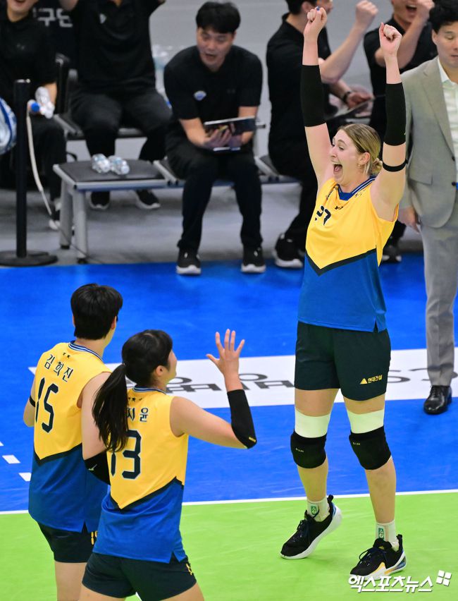 4일 오후 경기도 수원실내체육관에서 열린 진에어 2025-2026 V-리그 현대건설과 기업은행의 경기, 현대건설 카리가 서브 득점을 성공한 후 기뻐하고 있다. 김한준 기자 kowel@xportsnews.com
