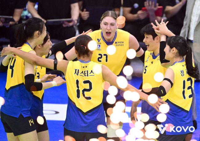 여자 프로배구 현대건설. (사진=KOVO 제공). 2025.11.04. *재판매 및 DB 금지 [서울=뉴시스]박윤서 기자 = 여자 프로배구 현대건설이 IBK기업은행을 상대로 왼승을 거두고 단독 선두로 올라섰다. 현대건설은 4일 수원체육관에서 열린 진에어 2025~2026 V-리그 여자부 IBK기업은행과의 홈 경기에서 세트 점수 3-0(25-20 25-20