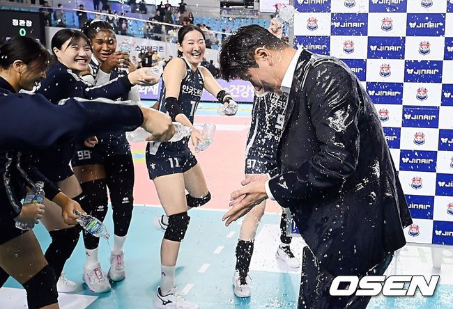 5일 김천실내체육관에서 진에어 2025-2026시즌 V리그 여자부 한국도로공사와 정관장의 경기가 열렸다. '쿠바 특급' 실바와 득점왕 경쟁을 펼치고 있는 '카메룬 괴물' 모마가 얼마나 많은 득점을 보여줄지 기대된다.한국도로공사 김종민 감독이 200승을 기록하고 선수들의 축하 물세례를 받고 있다. 2025.11.05 / foto0307@osen.co.kr 5