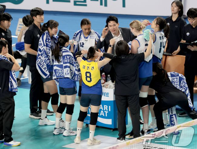 (서울=뉴스1) = 현대건설 강성형 감독이 8일 경북 김천실내체육관에서 열린 진에어 2025-26 V-리그 프로배구대회 현대건설과 도로공사와의 경기에서 선수들에게 작전 지시를 하고 있다. (현대건설 배구단 제공. 재판매 및 DB 금지) 2025.11.8/뉴스1 ssaji@news1.kr Copyright ⓒ 뉴스1. All rights reserved. 무