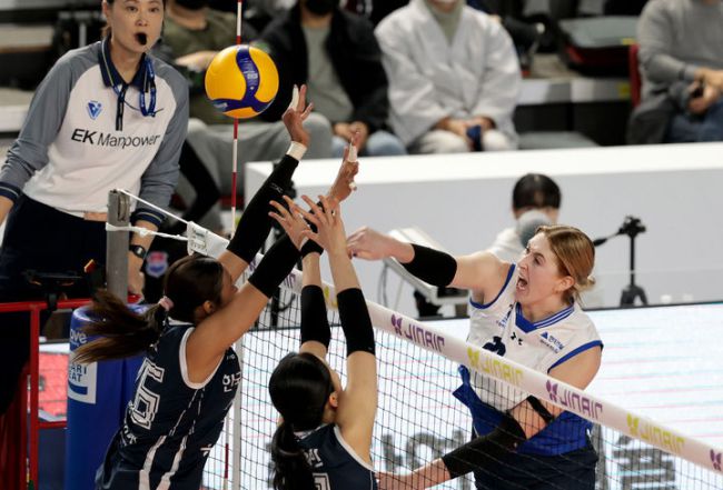 [서울=뉴시스] 추상철 기자 = 8일 김천실내체육관에서 열린 진에어 2025-26 V-리그 프로배구대회 현대건설과 도로공사와의 경기, 현대건설 카리가 강스파이크를 하고 있다. (사진= 현대건설 배구단 제공) 2025.11.09. photo@newsis.com *재판매 및 DB 금지 [사진 영상 제보받습니다] 공감언론 뉴시스가 독자 여러분의 소중한 제보를 기