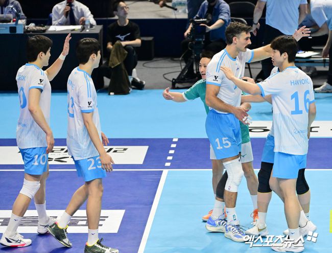 12일 오후 인천 계양체육관에서 열린 '진에어 2025-2026 V-리그' 대한항공과 삼성화재의 경기, 대한항공 선수들이 득점 후 기뻐하고 있다. 김한준 기자 kowel@xportsnews.com