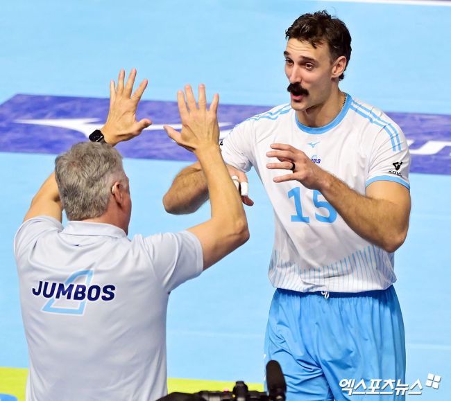 12일 오후 인천 계양체육관에서 열린 '진에어 2025-2026 V-리그' 대한항공과 삼성화재의 경기, 대한항공이 삼성화재에 세트스코어 3:0(25-16 25-22 25-22)으로 승리하며 4연승을 기록했다. 이날 경기에서 승리한 대한항공 헤난 감독이 러셀과 하이파이브를 하고 있다. 김한준 기자 kowel@xportsnews.com