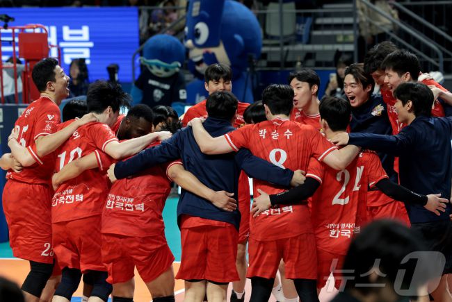 (서울=뉴스1) = 14일 서울 중구 장충체육관에서 열린 진에어 2025-26 V-리그 프로배구대회 한국전력과 우리카드의 경기에서 승리한 한국전력 선수들이 자축하고 있다. 한국전력이 우리카드를 3대0 셧아웃으로 누르고 승리를 가져왔다. (한국전력 배구단 제공. 재판매 및 DB 금지) 2025.11.14/뉴스1 pjh2035@news1.kr Copyright
