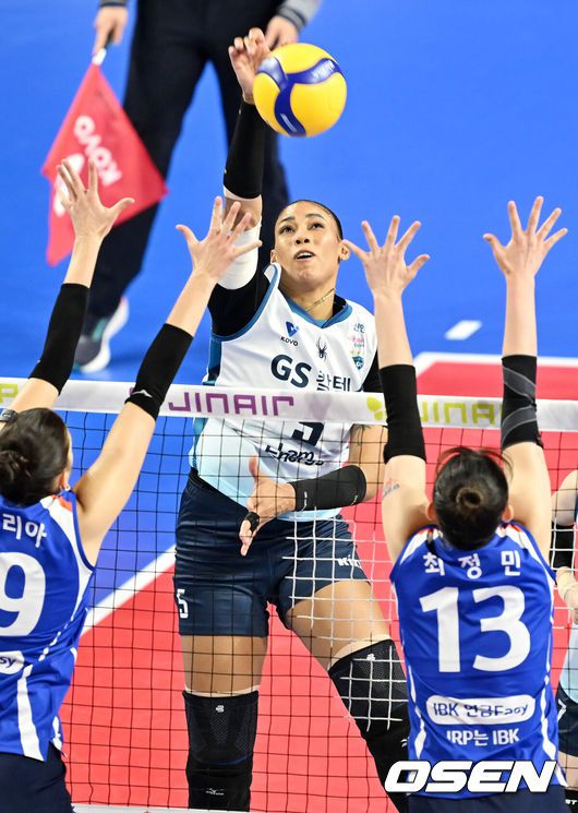 14일 오후 경기 화성종합실내체육관에서 ‘진에어 2025~2026 프로배구 V리그’ 여자부 IBK기업은행 알토스와 GS칼텍스 서울KIXX의 경기가 열렸다.홈팀 IBK기업은행은 1승 5패 7위에, 어웨이팀 GS칼텍스는 3승 3패로 4위에 랭크되어 있다. 1세트 GS칼텍스 실바가 강타를 때리고 있다. 2025.11.14 / rumi@osen.co.kr GS칼텍