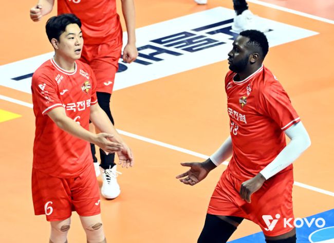 [서울=뉴시스] 남자배구 한국전력 베논(오른쪽)과 하승우가 14일 서울 장충체육관에서 열린 진에어 2025~2026 V-리그 남자부 우리카드와의 경기에서 득점을 올린 뒤 서로 격려하고 있다. (사진=KOVO 제공) 2025.11.14. *재판매 및 DB 금지 [서울=뉴시스]문채현 기자 = 남자배구 한국전력의 세터 하승우와 외국인 에이스 베논의 호흡이 경기를