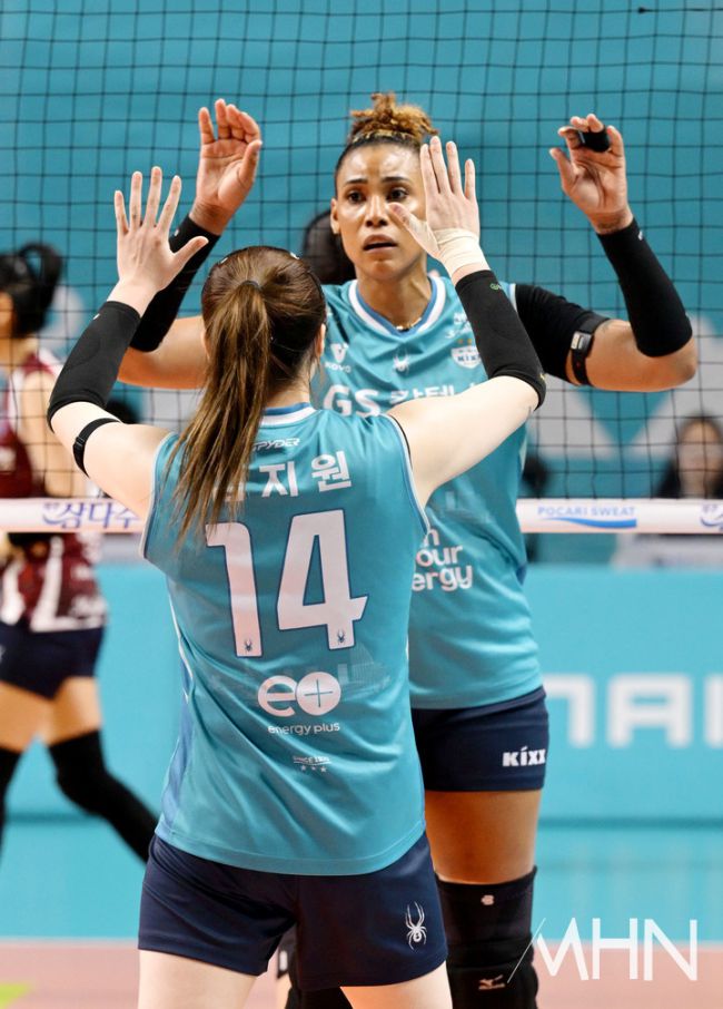10일 오후 서울 장충체육관에서 2025-26시즌 진에어 V-리그 여자부 GS칼텍스와 IBK기업은행의 경기가 열렸다. 이날 GS칼텍스 실바가 공격 성공 후 김지원과 기뻐하고 있다.