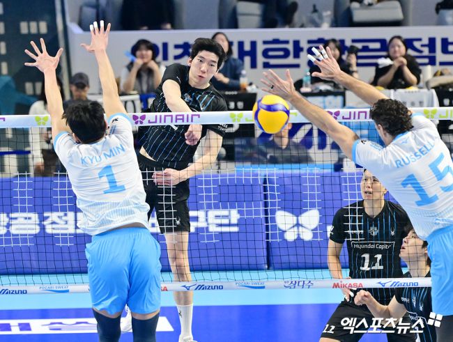 16일 오후 인천 계양체육관에서 열린 '진에어 2025-2026 V-리그' 대한항공과 현대캐피탈의 경기, 현대캐피탈 허수봉이 공격을 시도하고 있다. 김한준 기자 kowel@xportsnews.com