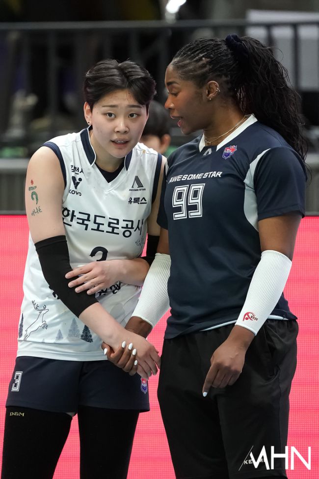18일 수원실내체육관에서 '2025-2026 V-리그 여자부' 한국도로공사(1위-승점35-13승2패) 대 현대건설(2위-승점29-9승6패) 경기가 열렸다. 이날 결과에 따라 승점 차는 최소 3점으로 좁혀지거나, 최대 9점까지 벌어질 수 있다. 도로공사 김다은, 모마가 스트레칭을 하고 있다.