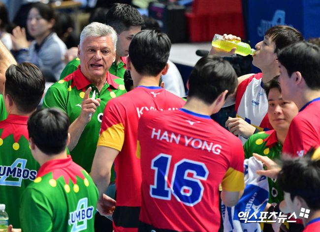 19일 오후 인천 계양체육관에서 열린 '진에어 2025-2026 V-리그' 대한항공과 한국전력의 경기, 대한항공 헤난 감독이 작전타임을 갖고 있다. 김한준 기자 kowel@xportsnews.com