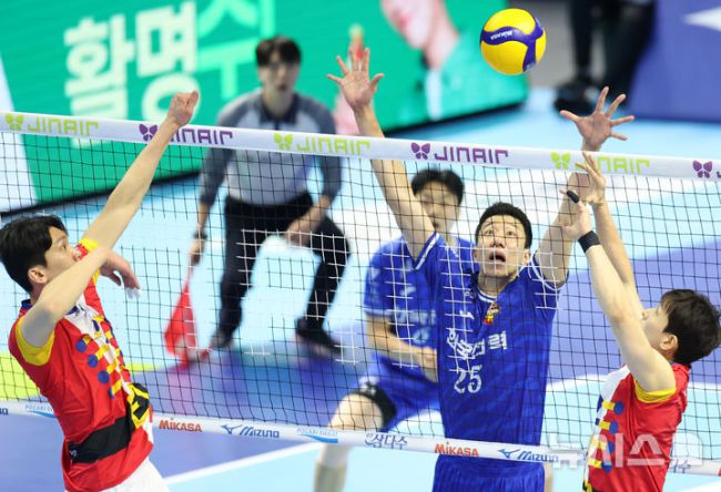 [인천=뉴시스] 황준선 기자 = 19일 인천계양체육관에서 열린 진에어 2025~2026 V-리그 남자부 한국전력 빅스톰과 대한항공 점보스의 경기, 한국전력 신영석이 수비하고 있다. 2025.12.19. hwang@newsis.com [서울=뉴시스]문채현 기자 = 내년 1월 열리는 2025~2026 V-리그 올스타전 출전 선수 명단이 확정됐다. 한국배구연맹(