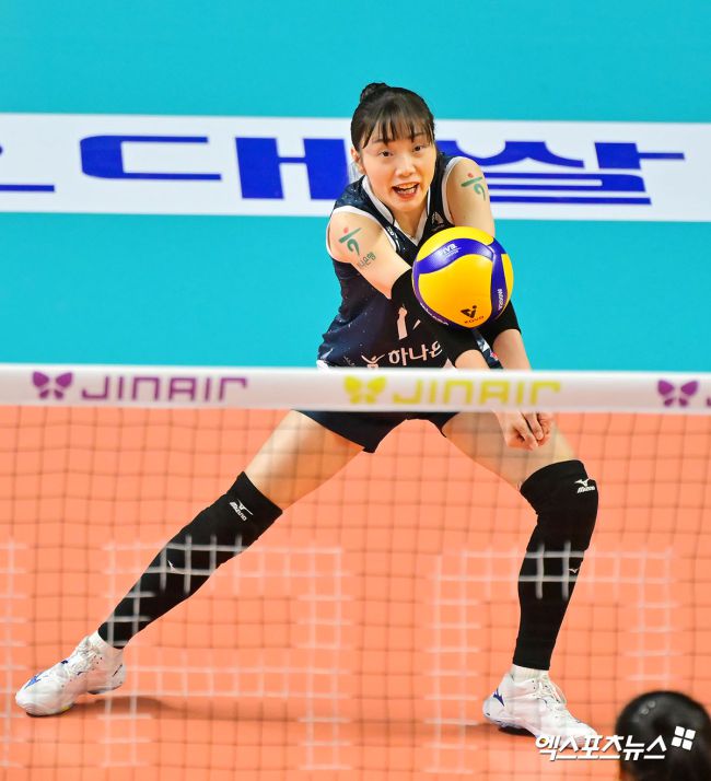 23일 오후 서울 장충체육관에서 열린 '진에어 2025-2026 V-리그' GS칼텍스와 한국도로공사의 경기, 도로공사 문정원이 서브를 받고 있다. 김한준 기자 kowel@xportsnews.com