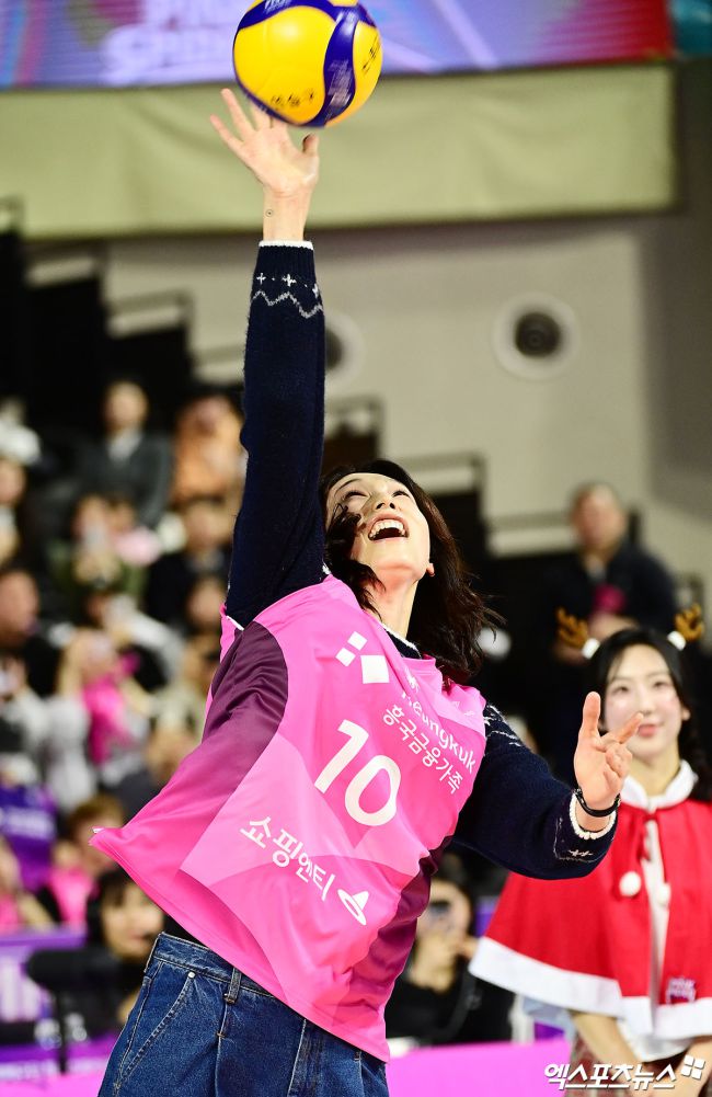 24일 오후 인천 삼산월드체육관에서 열린 '진에어 2025-2026 V-리그' 흥국생명과 IBK기업은행의 경기에 앞서 흥국생명 김연경 어드바이저가 시구를 하고 있다. 박지영 기자 jypark@xportsnews.com