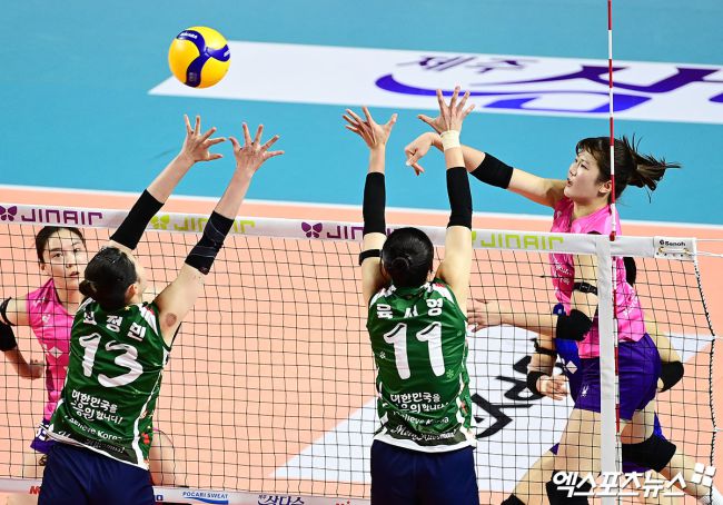 24일 오후 인천 삼산월드체육관에서 열린 '진에어 2025-2026 V-리그' 흥국생명과 IBK기업은행의 경기, 흥국생명 김다은이 공격을 시도하고 있다. 박지영 기자 jypark@xportsnews.com