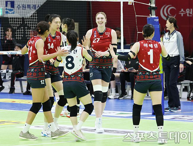 2025-2026 진에어 V-리그 여자부 현대건설과 정관장의 경기가 25일 경기도 수원시 수원체육관에서 열렸다. 현대건설 선수들이 득점 성공에 기뻐하고 있다. 2025.12.25. [스포츠투데이 권광일 기자 sports@stoo.com]