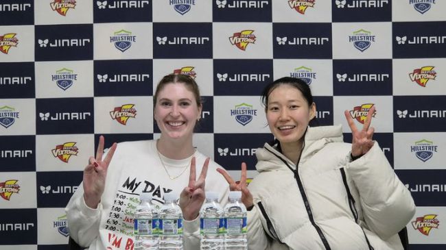 [수원=뉴시스] 문채현 기자 = 여자 프로배구 현대건설의 카리(왼쪽)과 나현수가 25일 수원체육관에서 열린 진에어 2025~2026 V-리그 정관장과의 경기에서 승리한 뒤 취재진과 인터뷰를 하고 있다. 2025.12.25. dal@newsis.com *재판매 및 DB 금지 [수원=뉴시스]문채현 기자 = 무릎 부상에도 통증을 안고 뛰는 에이스와 그의 빈자리를