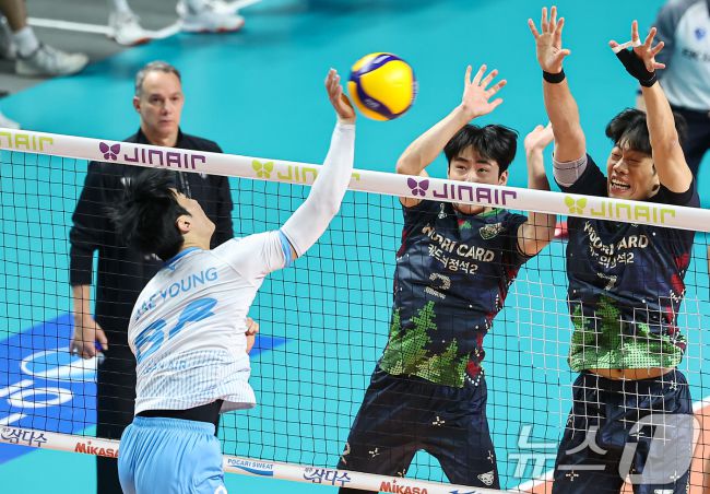 (서울=뉴스1) 김도우 기자 = 28일 서울 중구 장충체육관에서 열린 진에어 2025-26 V-리그 프로배구대회 우리카드와 대한항공의 경기, 대한항공 임재영이 공격을 시도하고 있다. 2025.12.28/뉴스1 pizza@news1.kr Copyright ⓒ 뉴스1. All rights reserved. 무단 전재 및 재배포, AI학습 이용 금지.