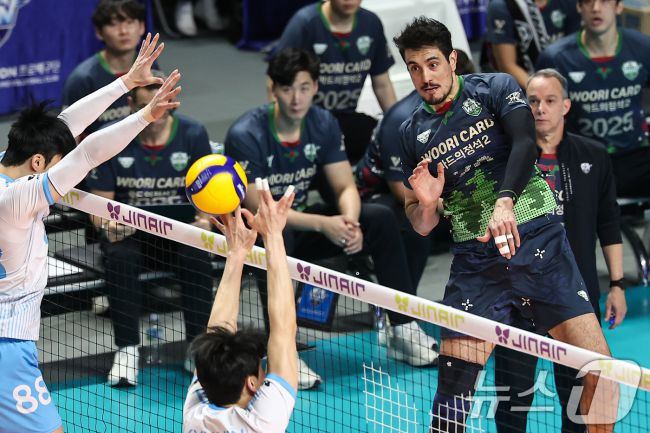 (서울=뉴스1) 김도우 기자 = 28일 서울 중구 장충체육관에서 열린 진에어 2025-26 V-리그 프로배구대회 우리카드와 대한항공의 경기, 우리카드 아라우조가 공격을 시도하고 있다. 2025.12.28/뉴스1 pizza@news1.kr Copyright ⓒ 뉴스1. All rights reserved. 무단 전재 및 재배포, AI학습 이용 금지.