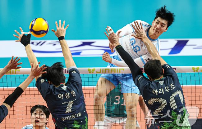 (서울=뉴스1) 김도우 기자 = 28일 서울 중구 장충체육관에서 열린 진에어 2025-26 V-리그 프로배구대회 우리카드와 대한항공의 경기, 대한항공 임재영이 공격을 시도하고 있다. 2025.12.28/뉴스1 pizza@news1.kr Copyright ⓒ 뉴스1. All rights reserved. 무단 전재 및 재배포, AI학습 이용 금지.
