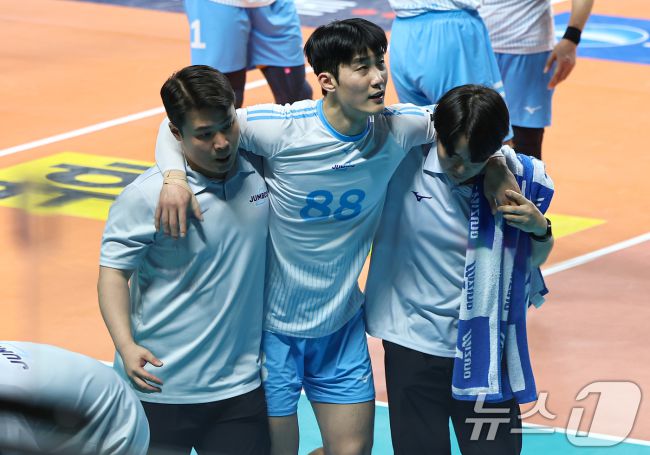 (서울=뉴스1) 김도우 기자 = 28일 서울 중구 장충체육관에서 열린 진에어 2025-26 V-리그 프로배구대회 우리카드와 대한항공의 경기, 대한항공 임재영이 부상으로 교체되고 있다. 2025.12.28/뉴스1 pizza@news1.kr Copyright ⓒ 뉴스1. All rights reserved. 무단 전재 및 재배포, AI학습 이용 금지.