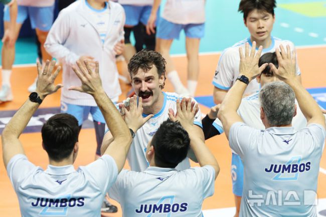 [서울=뉴시스] 조성우 기자 = 28일 오후 서울 중구 장충체육관에서 열린 2025~2026 V리그 남자부 우리카드와 대한항공의 경기, 대한항공 러셀 등 선수들이 세트스코어 3-1로 우리카드에 승리한 뒤 기뻐하고 있다. 2025.12.28. xconfind@newsis.com [서울=뉴시스]안경남 기자 = 남자 프로배구 선두 대한항공이 부상 악재 속에 우리
