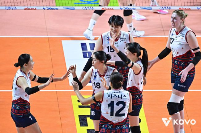 [서울=뉴시스] 여자 프로배구 현대건설. (사진=KOVO 제공). 2025.12.31. *재판매 및 DB 금지 [서울=뉴시스]박윤서 기자 = 여자 프로배구 현대건설이 접전 끝에 흥국생명을 꺾고 파죽의 8연승을 질주했다. 현대건설은 31일 인천 삼산월드체육관에서 열린 진에어 2025~2026 V-리그 여자부 흥국생명과의 원정 경기에서 세트 점수 3-2(25-