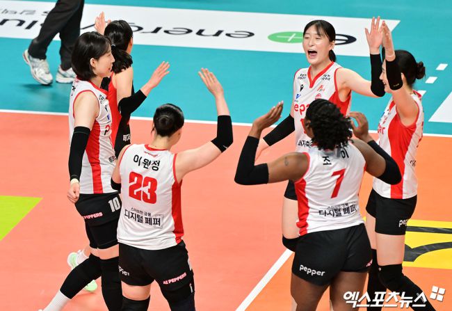 6일 오후 서울 장충체육관에서 열린 '진에어 2025-2026 V-리그' GS칼텍스와 페퍼저축은행의 경기, 페퍼저축은행 선수들이 득점 후 기뻐하고 있다. 김한준 기자 kowel@xportsnews.com