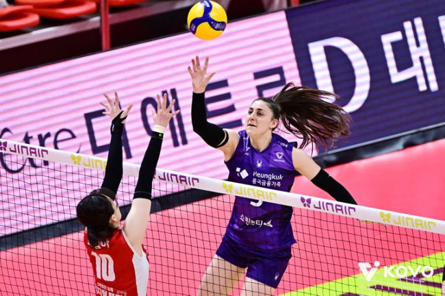 [서울=뉴시스] 여자 프로배구 흥국생명의 피치가 9일 광주페퍼스타디움에서 열린 진에어 2025~2026 V-리그 여자부 페퍼저축은행과의 경기에서 공격을 시도하고 있다. (사진=KOVO 제공) 2026.01.09. [서울=뉴시스]문채현 기자 = 여자 프로배구 흥국생명이 철벽 블로킹을 선보인 피치의 활약과 함께 연승에 성공했다. 흥국생명은 9일 광주페퍼스타디움