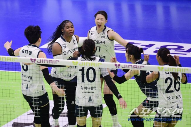 18일 수원체육관에서 열린 V리그 여자부 현대건설과 한국도로공사의 경기.득점 후 기쁨을 나누고 있는 도로공사 선수들. 수원=송정헌 기자songs@sportschosun.com/2025.12.18/ "선수들이 편하게 느끼는 것도 있고…." 한국도로공사 하이패스는 10일 김천 실내체육관에서 진에어 2025~2026 V-리그 여자부 GS칼텍스 서울 Kixx와의