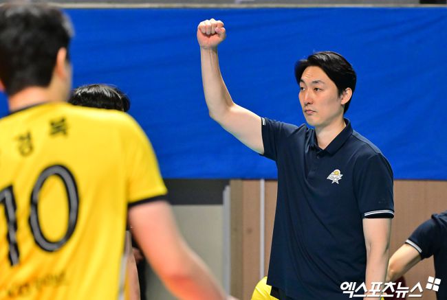 11일 오후 서울 장충체육관에서 열린 '진에어 2025-2026 V-리그' 우리카드와 KB손해보험의 경기, KB손해보험 하현용 감독대행이 기뻐하고 있다. 김한준 기자 kowel@xportsnews.com