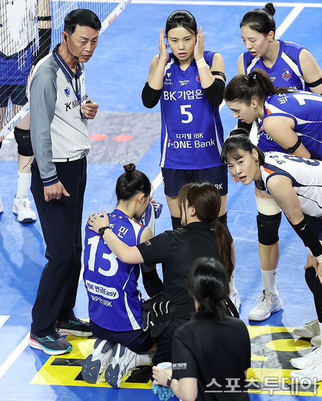 2025-2026 진에어 V-리그 여자부 IBK기업은행-현대건설 경기가 11일 경기도 화성시 화성종합경기타운에서 열렸다. IBK기업은행이 최정민이 얼굴에 공을 맞아 잠시 코트에 앉아 치료를 받고 있다. 2026.01.11. [스포츠투데이 권광일 기자 sports@stoo.com]