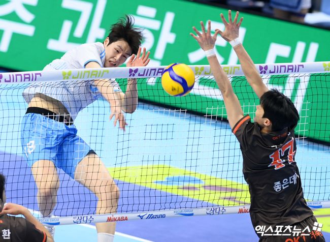 13일 오후 인천 계양체육관에서 열린 '진에어 2025-2026 V-리그' 대한항공과 OK저축은행의 경기, 대한항공 최준혁이 공격을 시도하고 있다. 고아라 기자 iknow@xportsnews.com