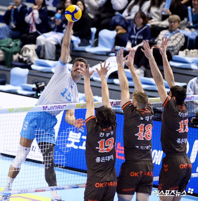 13일 오후 인천 계양체육관에서 열린 '진에어 2025-2026 V-리그' 대한항공과 OK저축은행의 경기, 대한항공 러셀이 공격을 시도하고 있다. 고아라 기자 iknow@xportsnews.com