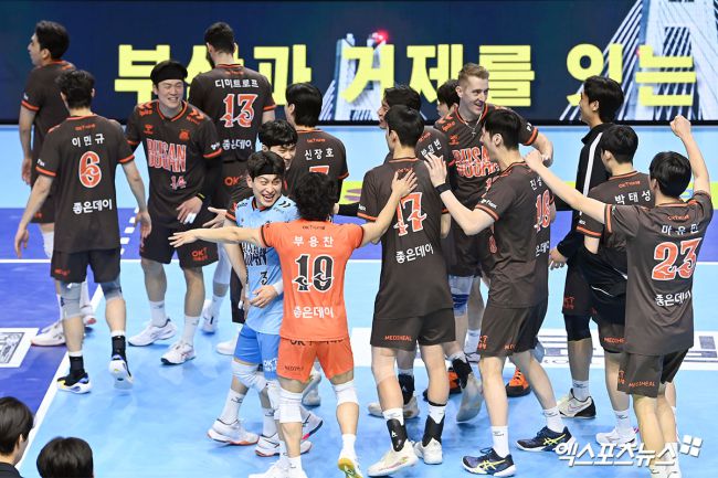 13일 오후 인천 계양체육관에서 열린 '진에어 2025-2026 V-리그' 대한항공과 OK저축은행의 경기, OK저축은행이 풀세트 접전 끝에 세트 스코어 3:2(21-25 25-20 20-25 30-28 15-13)로 승리를 거뒀다. 이날 경기를 승리로 마친 OK저축은행 선수들이 기뻐하고 있다. 고아라 기자 iknow@xportsnews.com