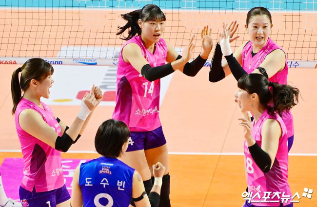 14일 오후 인천 부평구 삼산월드체육관 열린 '진에어 2025-2026 V-리그' 흥국생명과 한국도로공사의 경기, 흥국생명 정윤주가 득점 후 기뻐하고 있다. 김한준 기자 kowel@xportsnews.com