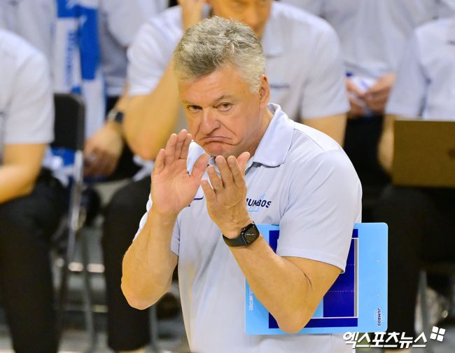 16일 오후 경기도 의정부실내체육관에서 열린 '진에어 2025-2026 V-리그' KB손해보험과 대한항공의 경기, 대한항공 헤난 감독이 박수를 치고 있다. 김한준 기자 kowel@xportsnews.com