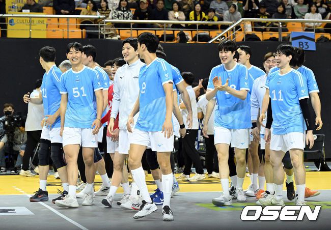 대한항공은 의정부 경민대학교기념관에서 진행된 진에어 2025~2026 V-리그 KB손해보험과 경기에서 세트스코어 3-1(25-18, 26-24, 31-33, 27-25)로 승리했다. 대한항공은 길었던 4연패에서 탈출했다. 경기 후 대한항공 선수들이 승리의 기쁨을 나누고 있다. 2026.01.16 /sunday@osen.co.kr